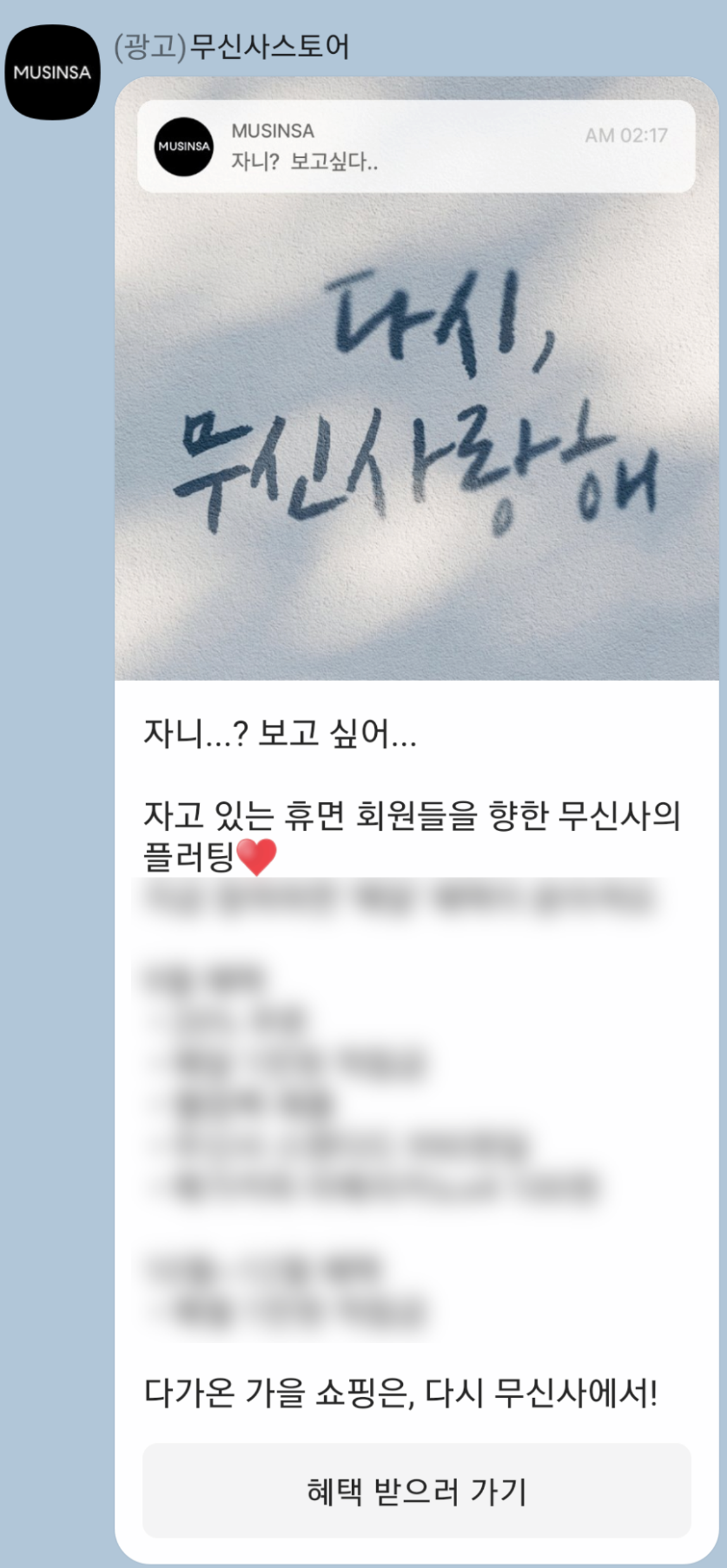 - 프로모션 컨셉 기획 및 혜택은 다른 담당자들이 기획하였다. 그 톤을 살려서 메시지 발송을 기획하는게 CRM 마케터의 역할이다. 톤을 살릴 수 있을까 의문이 들어서 프로모션 기획자에게 발송 문구 워싱 요청을 하였다. 찰떡같이 다듬어주셔서 감사했다. 0과1로 기획하는 사람에게 갬성문구 작성 넘나 어려운 것..