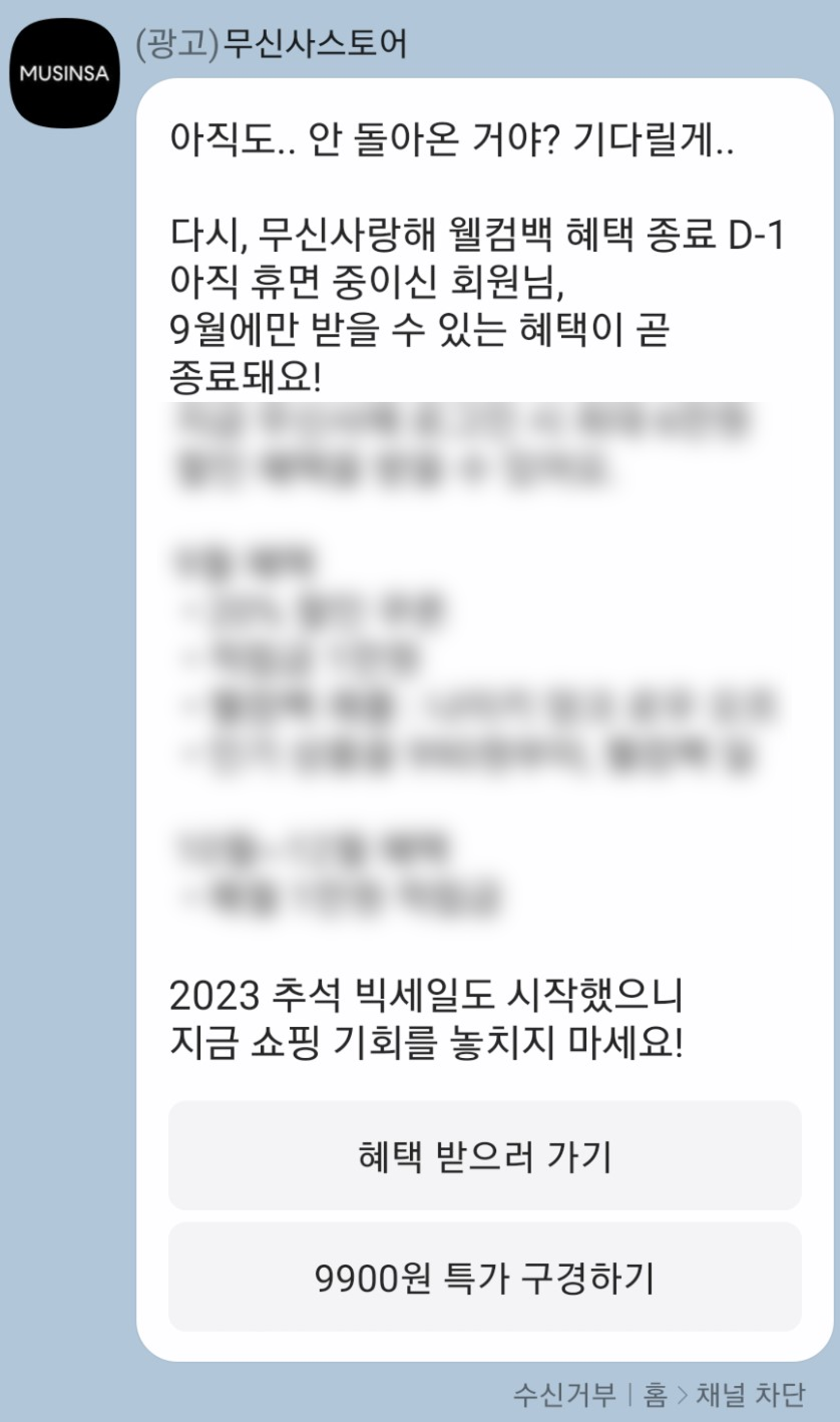 - 휴면회원 캠페인의 1차 종료일은 9월30일까지이다. 종료 직전에 다시 한번 타겟 회원들에게 프로모션 리마인드가 필요했다.