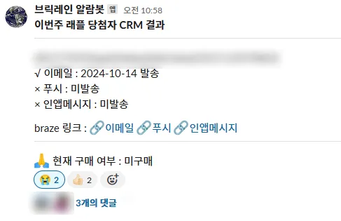 - 회원 유니크값과 브레이즈 바로가기 링크를 통해 회원이 이메일을 개봉하였음에도 구매하지 않음을 빠르게 포착했다.